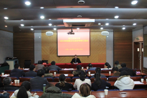 浙農林大新聞網訊 為進一步加強對我校校園文化活動的統籌規劃,提升校園文化活動的育人成效,12月30日,學校在活動中心視聽室202舉行2013年校園文化活動考核匯報會,校黨委副書記余杰出席匯報會,宣傳部、學工部、研工部、保衛處、團委等有關部門負責人及各二級學院分管學生工作負責人參加了匯報,匯報會由校園文化活動工作小組成員擔任評委。