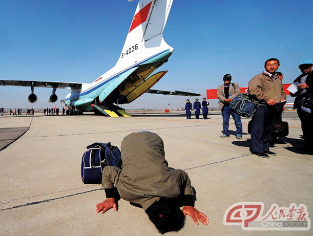 2011年3月4日,北京南苑機場,41歲的中國水電二局工人馮克榮一下飛機,就激動地跪吻祖國土地。2011年2月28日下午,經中央軍委批準,空軍4架伊爾76型運輸機從烏魯木齊機場飛赴利比亞,執行撤離中國在利比亞人員任務。這是中國空軍首次派運輸機赴海外執行撤離中國人員回國任務。3月4日,4架飛機先后降落在北京南苑機場,機上搭乘的287名在利比亞的同胞回到了祖國懷抱。隨著利比亞局勢持續惡化,各國都將撤離本國人員提上議事日程。但唯獨中國自始至終由政府主導,以舉國之力傾情救援,從國家領導人關注,國務院成立應急指揮部統籌協調,到派出前方工作組,駐外使館聯動,軍民協作,都是國際上的創新之舉。