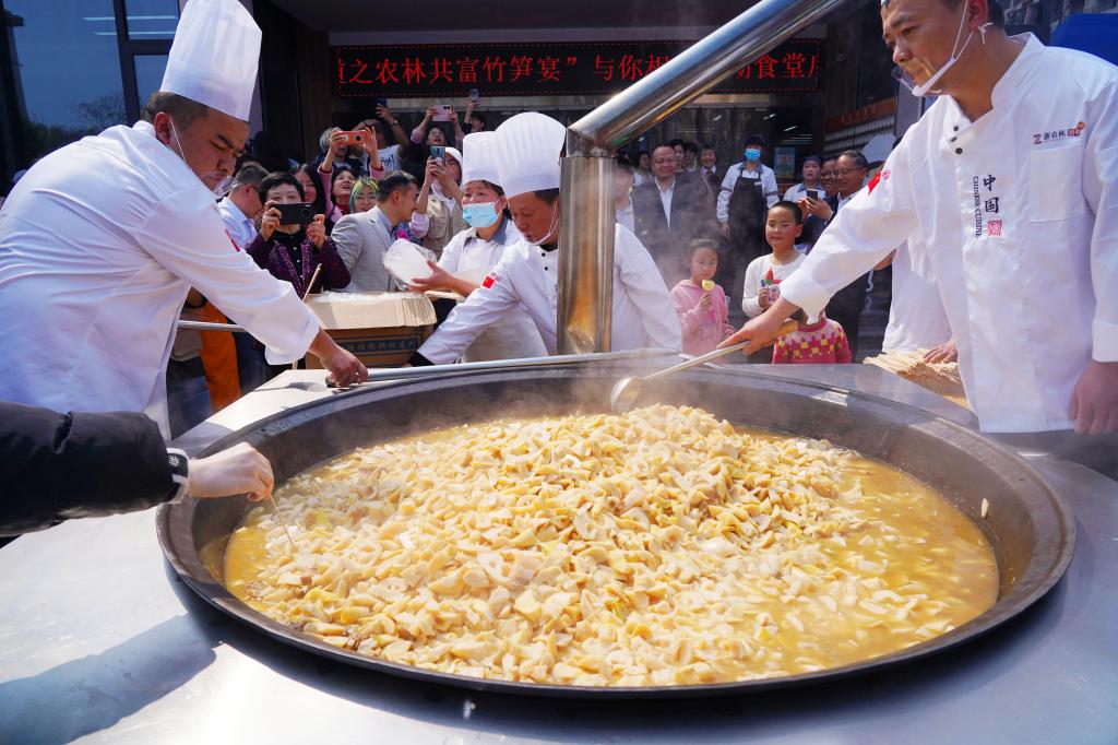 當(dāng)天,浙江農(nóng)林大學(xué)用超大鐵鍋燉1800斤鮮肉春筍供學(xué)生免費(fèi)嘗“鮮”,還舉辦了一系列和筍竹有關(guān)的活動,引導(dǎo)師生感受筍竹文化、體驗竹科技。