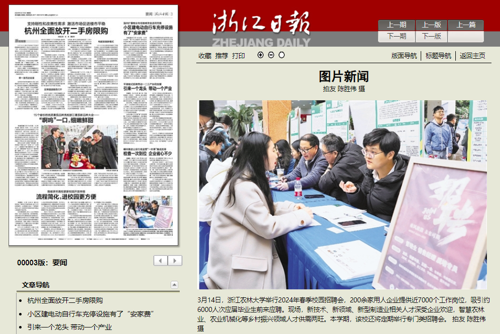 3月14日,浙江農林大學舉行2024年春季校園招聘會,200余家用人企業提供近7000個工作崗位,吸引約6000人次應屆畢業生前來應聘。現場,新技術、新領域、新型制造業相關人才深受企業歡迎,智慧農林業、農業機械化等鄉村振興領域人才供需兩旺。本學期,該校還將定期舉行專門類招聘會。