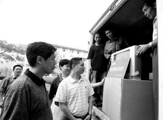 謝云激動(dòng)地收下了這一袋花生,而且還把這一袋花生分給了同事,她開(kāi)玩笑地說(shuō),“吃了農(nóng)民們的花生,就要幫農(nóng)民做事情啊,以后茅山村的果園里有什么技術(shù)上的困難,各位老師都要幫助啊。”林學(xué)院將一批彩電回送給村民。