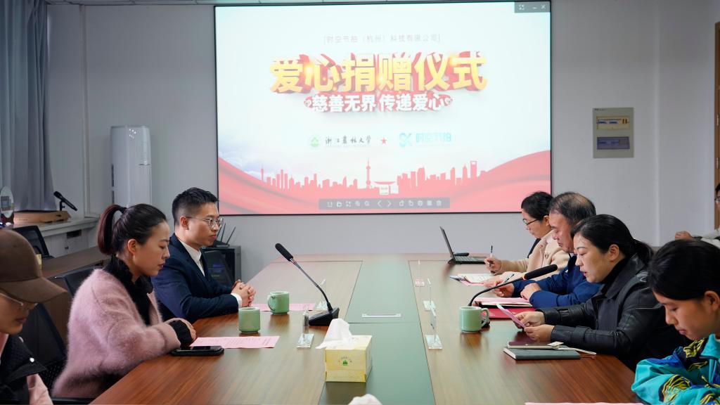 捐贈儀式上,學院領導向捐贈企業表示感謝,同時希望今后能與公司在數智教育、競賽育人等方面進一步加強合作。捐贈方代表厲軍表達了對母校的感恩之情,并希望公司和學院能在產學研、人才培養、實習實踐等方面深度合作,為學生提供更多的實習實踐機會和更好的平臺。儀式最后,時空節拍(杭州)科技有限公司向學校捐贈20萬元用于文法學院教育發展項目,學院黨委書記朱紅東為其頒發捐贈證書,并合影留念。