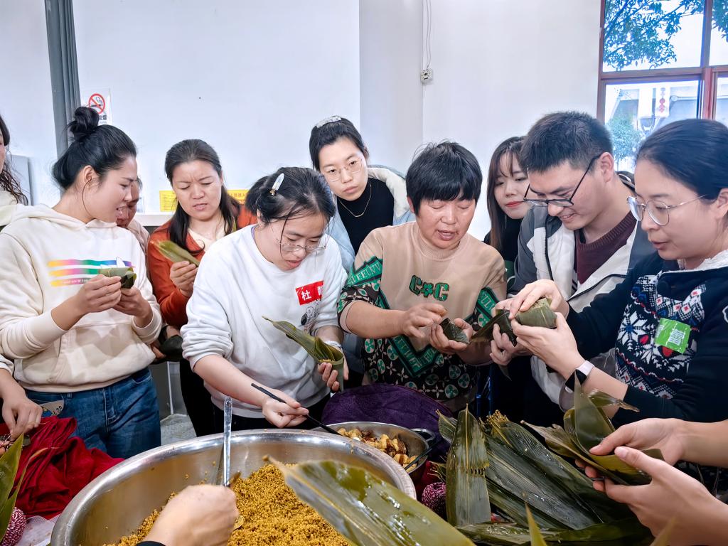 包包子時,大家有條不紊,分工合作,揪劑子,搟面皮,加餡料,捏包子,動作嫻熟,一氣呵成。不一會兒,大小勻稱,花褶細密均勻,收口干凈美觀的一排排包子,整齊地擺上了臺面。在包粽子環節中,大家一邊交流南北方粽子的差異,一邊挑粽葉、折粽葉、填糯米、放餡料、裹葉子、扎粽繩,個個動作嫻熟、各施絕技,年青老師們也是邊看邊學、漸至佳境。