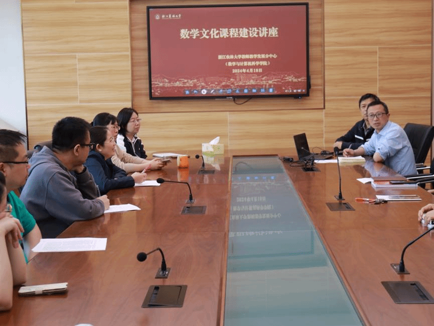 4月18日,數計學院教師教學發展分中心在學11-304會議室開展《數學文化》課程建設講座,邀請臺州學院俞優莉老師做了《數學文化》課程建設專題報告。數學學科全體教師參加本次活動。