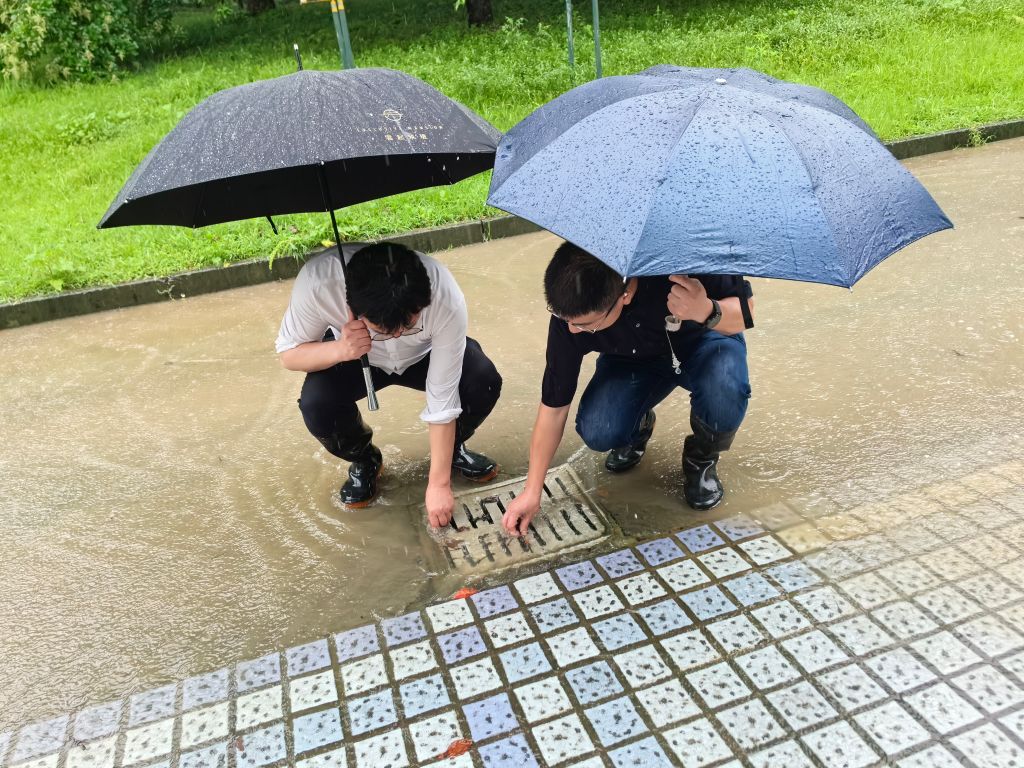 在支部書記和部門負責人的帶領下,巡查小組分4組深入校園各個區域,仔細巡查校園內排水設施及排水情況,護校河、東湖及牛頭山水庫的水位情況,檢查校園周邊山體、坡地、圍墻是否有松動、坍塌等安全隱患,巡查學生宿舍、教學樓、學院樓、圖書館及各實驗室大樓建筑物的周邊環境,檢查是否存在積水隱患以及建筑物的防水情況。在巡查過程中,發現有排水不暢的排水口,黨員干部立即徒手進行清理,對發現的問題和隱患,能整改的現場整改,無法立即整改的記錄在案,列入校園維修改造計劃。
