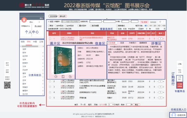 為服務廣大讀者的采選需求,本次展會品種按專業(yè)類目展示,基于中國圖書館分類法為主,高校學科分類、云淘(電商)分類、出版社分類為輔分別歸集設置書目區(qū)域,并同步設立重點圖書推薦區(qū)。部分圖書品種支持試聽、試讀、試看,千余種即將出版的新書搶先知曉,百余位在線客服于云端答疑解惑。采選時間不受限制,隨時隨地線上操作,歡迎大家積極參與其中,圖書館將根據(jù)薦購情況酌情下訂。