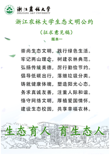 為深入學(xué)習(xí)宣傳貫徹習(xí)近平生態(tài)文明思想,全面貫徹學(xué)校第三次黨代會(huì)精神,落實(shí)“生態(tài)育人、育生態(tài)人”工程,讓生態(tài)理念貫穿學(xué)校思政工作各方面和人才培養(yǎng)全過(guò)程,學(xué)校擬出臺(tái)浙江農(nóng)林大學(xué)“生態(tài)文明公約”。經(jīng)前期醞釀,初步篩選,擬定兩版征求意見(jiàn)稿,請(qǐng)全體師生踴躍參與投票,共同選出浙江農(nóng)林大學(xué)“生態(tài)文明公約”。